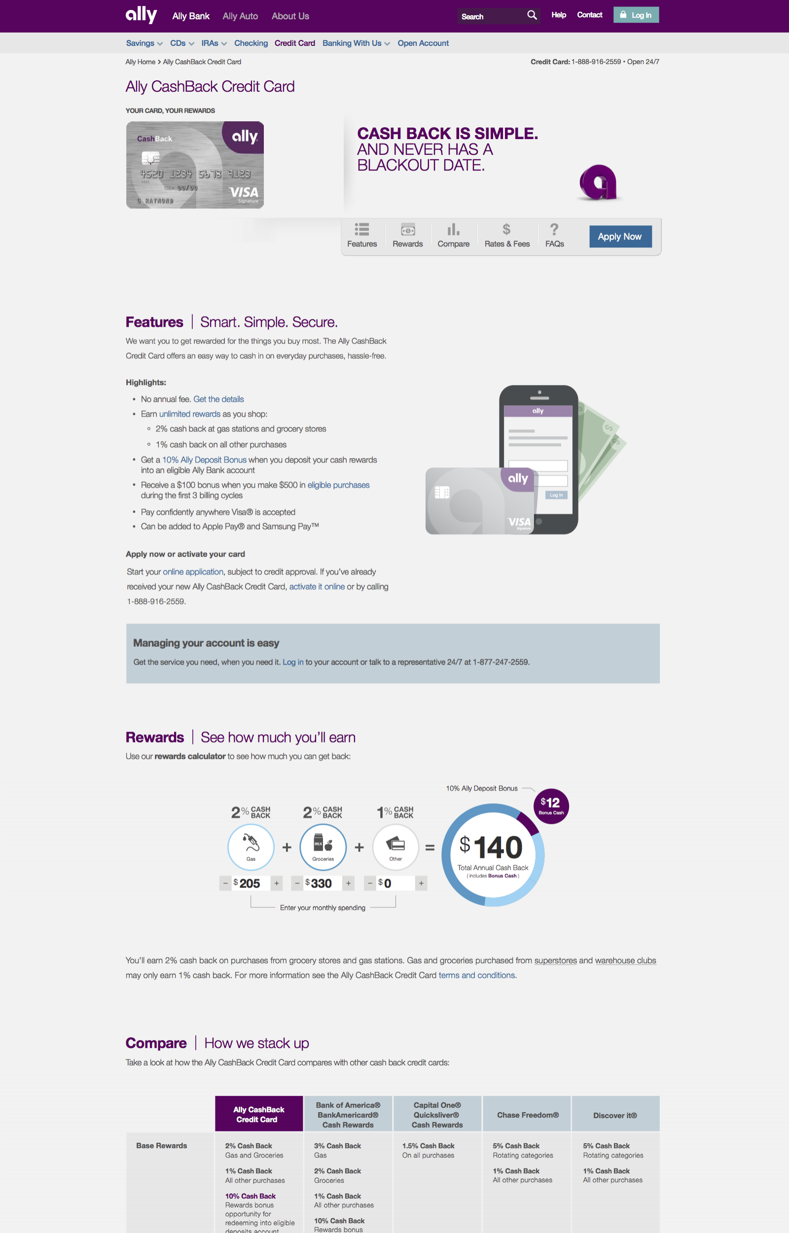 Ally launched its first credit card requiring UX across marketing, education, an interactive bonus cash calculator, and integration with third-party servicers for application and bonus cash management.