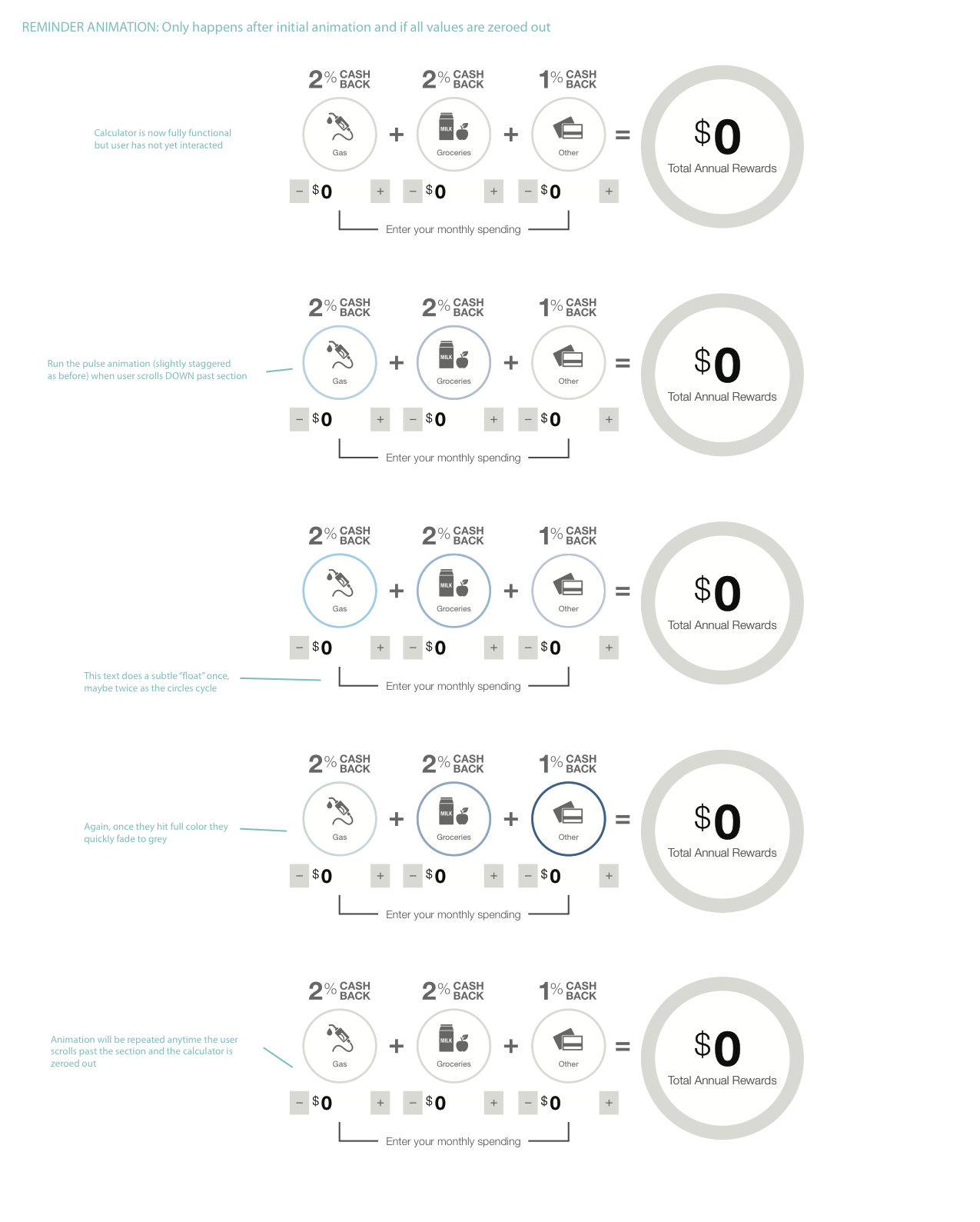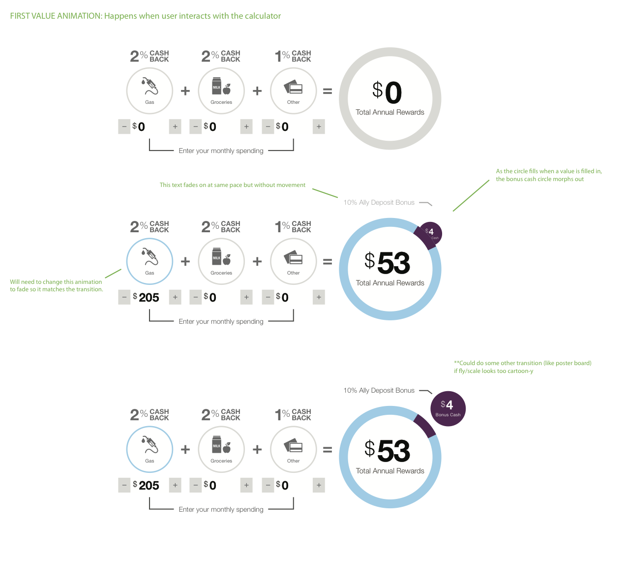 Designed the full credit card lifecycle — marketing, online application, informational pages, FAQs, and account servicing with bonus cash management. Built the bonus cash calculator grounded in internal user research showing what customers expected from a credit card product.