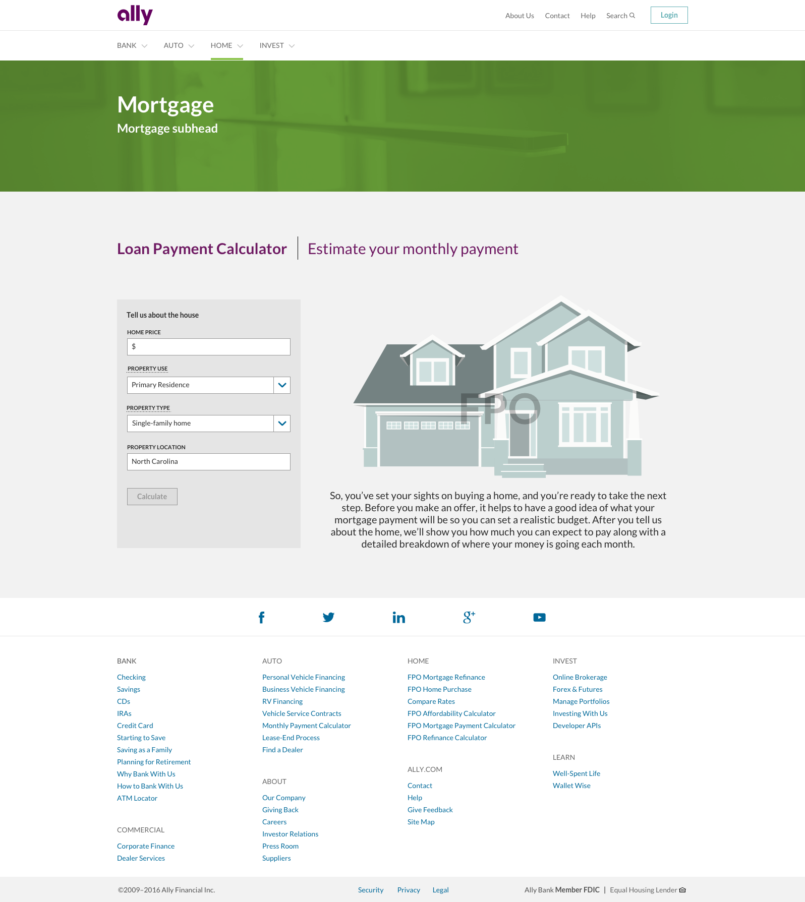 Ally launched its first mortgage product requiring end-to-end UX across storefront pages, marketing, a third-party servicer integration, a pre-qualification lead form, and live-rate calculators.