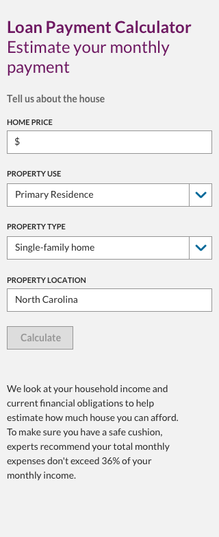IA over 9 months. Worked with product owners, content strategists, visual designers, marketing, third parties, and mobile/web/backend development. Led user research and testing, designed all three calculators, collaborated closely with visual designers and content strategists.