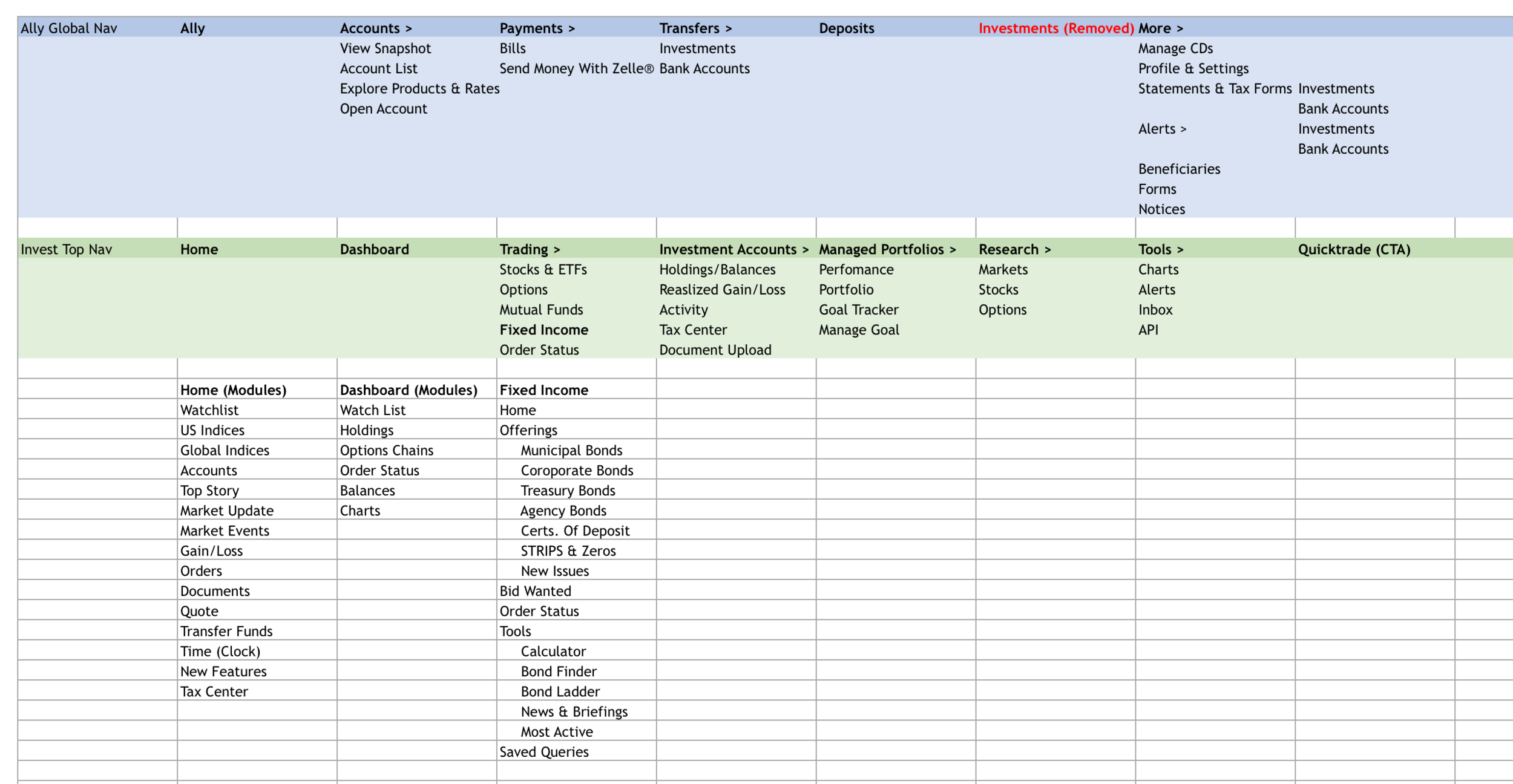 Conducted full content inventory and competitive analysis of navigation patterns across leading financial platforms. Designed unified navigation architecture and produced annotated screen-level designs across all major views and account types. Worked directly with engineering to ensure technical feasibility.