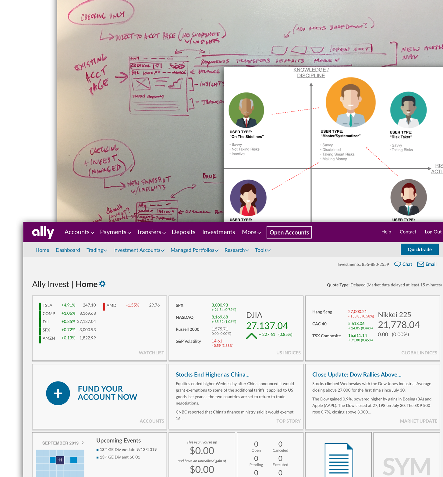 Modernized LIVE into a 2.0 release serving two distinct customer types — self-directed traders and managed portfolio investors — while navigating an acquired engineering team skeptical of UX. Full process: ethnographic research, persona development, journey mapping, whiteboard ideation, Sketch wireframing, InVision prototyping.